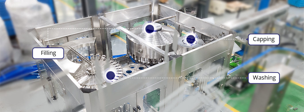 灌裝線可以通過更換少量備件,將天然泉水,純凈水,碳酸水,調(diào)味水注入PET瓶中。 | 灌水線的生產(chǎn)能力通常在1,000-36,000bph,可提供0.25-2.5L PET瓶。 | 自動(dòng)灌裝機(jī)采用沖洗/灌裝/封蓋三合一技術(shù),PLC控制,觸摸屏,主要由SUS304 / SUS316制成。 |